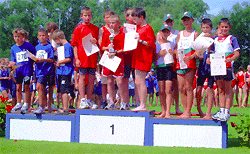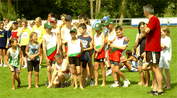 Deutsche Schüler Mannschafts - Meisterschaften 2003 Ende Juni standen für die erfolgshungrigen Leichtathleten aus Untermeitingen die Deutschen Schüler-Mannschafts-Meisterschaften, kurz DSMM für den Kreis Mittel und Nordschwaben an. Bei diesem Wettbewerb werden in den Disziplinen Sprint, Weitsprung und Wurf nur die jeweils besten zwei Athleten jeder Mannschaft sowie die Sprint Staffel gewertet. Dabei darf jeder Sportler nur an maximal drei Disziplinen antreten. Hier sind also nicht nur starke Leistungen ausschlaggebend, sondern auch ein geschicktes Taktieren der Trainer und Betreuer bei der Besetzung der Disziplinen. Die Buben des SV Untermeitingen gingen in den Altersklassen Schüler B (12-13 Jahre) und Schüler C (10-11 Jahre) als Titelverteidiger an den Start. Für beide Mannschaften begannen die Wettkämpfe nach Maß: Beide Staffeln konnten souverän gewonnen werden. Die Schüler B stellten auch in den folgenden Wettkämpfen ihre Ausnahmestellung unter Beweis: Marcus Tarnowski, Markus Habdank, Philipp Eberle und Florian Bihler siegten am Ende souverän mit 3.510 Punkten und über 600 Punkten Vorsprung. Wahrlich eine beeindruckende Vorstellung. Bei den Schülern C lief es allerdings nicht ganz so rund. Beim Weitsprung blieben alle Sportler unter ihren Möglichkeiten, und auch im Sprint konnte das eigentliche Leistungsvermögen nicht von allen gezeigt werden. So belegten Emanuel Gröber, Florian Schummer, Patrick Tarnowski, Kevin Krah und Jannis Eberlein am Ende den zweiten Platz. Die Mädchen der Schülerinnen C gingen zum ersten Mal in diesem Wettbewerb an den Start. Nach einer sehr guten Staffel mit dem zweiten Platz zeigten die Mädchen Kathrin Pawollek, Mona Baur, Sonja Eiser, Franziska Rath und Sabrina Jäksch einen ordentlichen Wettkampf. Mit etwas Pech wurden sie am Ende Fünfte, aber mit knappen Rückstand auf den dritten Platz. | ||||||||||||