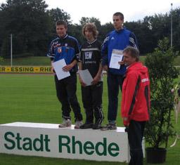Fest entschlossen, dieses Mal bei den Deutschen Meisterschaften eine Medaille zu erkämpfen, reisten Marcus Tarnowski und sein Trainer Michael May in´s westfälische Rhede. Als einziger bayerischer Teilnehmer im Block Lauf konnte sich Marcus mit der insgesamt drittbesten Punktzahl qualifizieren. Bei sehr schlechten Wetterverhältnissen begann der Wettkampf pünktlich um 12:50 Uhr. Marcus hatte einen schlechten Start: Für den 80m Hürdenlauf benötigte er 11,92 s, das waren mehr als 3/10 s über seiner Bestzeit. Beim Ballwurf erzielte er eine Weite von 60 m, womit er 4,5 m hinter seinen Möglichkeiten zurückblieb. Dennoch konnte man mit diesem Ergebnis zufrieden sein, zumal das Wetter immer schlechter wurde und Sturm aufkam. Mit dem Ergebnis des 100 m-Laufs konnte man zufrieden sein; er sprintete die Strecke in 12,20 s. Den Traum von einer Medaille konnte man vergessen, als Marcus im Weitsprung nur 5,33 m sprang, das waren mehr als 40 cm unter seiner Bestleistung. Beim 2000m-Lauf jedoch konnte er sich noch einmal steigern, mit 6:24,35 min. erzielte er eine Saisonbestleistung. Am Ende belegte Marcus mit 2697 Punkten einen sehr guten 7. Platz. | ||